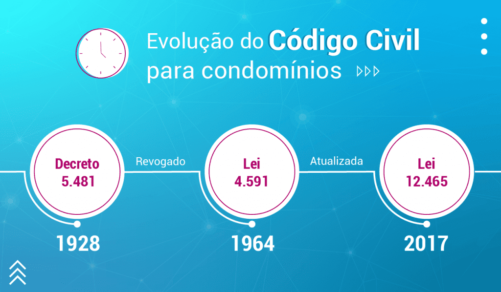 O primeiro regulamento que tratava sobre os condomínios foi o Decreto nº 5.481, de 1928. Ele abordava edifícios coletivos com mais de 5 andares destinados a residências particulares ou escritórios.