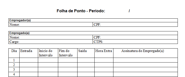 Cada colaborador tem uma folha, que deve ser preenchida com as informações do empregador e do empregado, marcando cada dia individualmente, nos horários de entrada e saída do trabalho, bem como a ida e a volta para o intervalo.